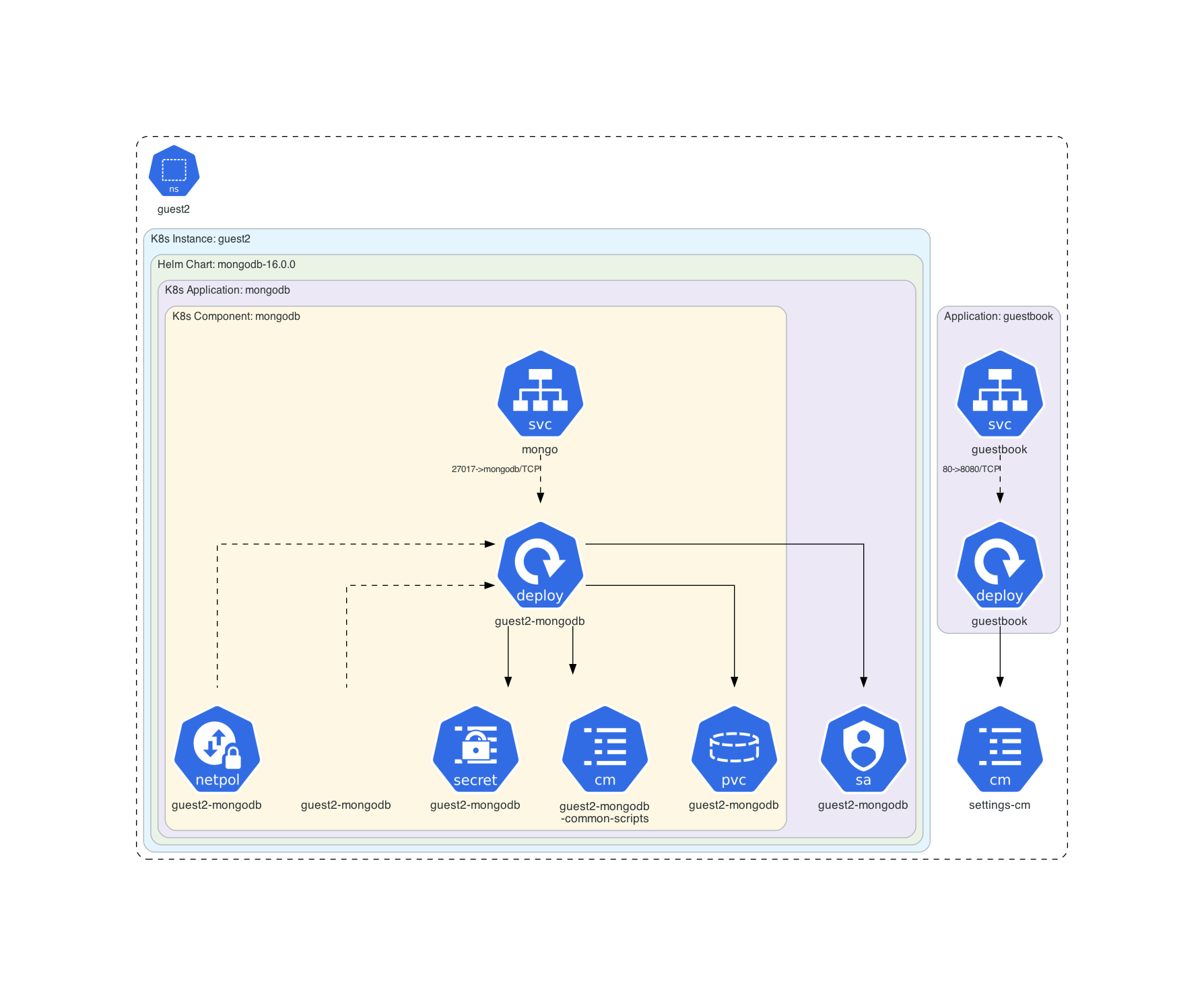 First, we have to build the dependency into our chart by running helm dependency build ./guestbook-mongo-dep/. After that, we can apply the new chart with helm install guest2 ./guestbook-mongo-dep/ -n guest2 --create-namespace.