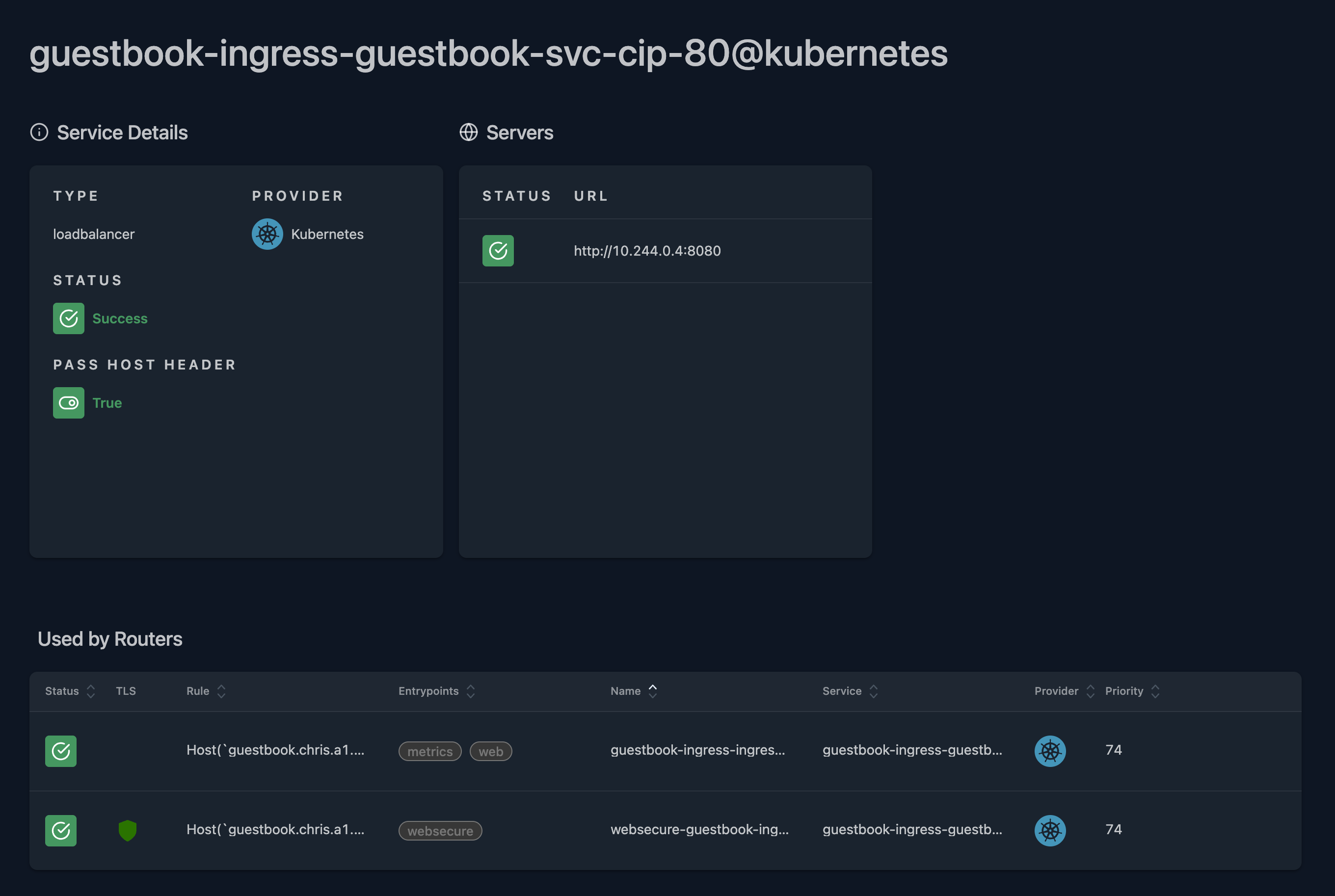 k logs -n traefik-ingress deployments/traefik 2025-08-12T21:00:49Z INF Updated ingress status ingress=ingress-resource namespace=guestbook-ingress - And the easiest one: We can check our fancy dashboard!